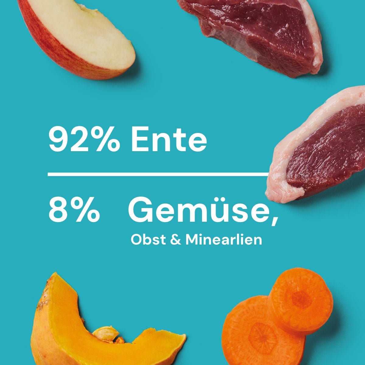 92 % Ente (47 % Fleisch, Karkasse, Haut, Leber, Herz), 3,2 % Chicorée (getrocknet), 1 % Kartoffel, 1 % Apfel, 1 % Spinat, 1 % Mineralstoffe, Rapsöl, 0,4 % Karotte