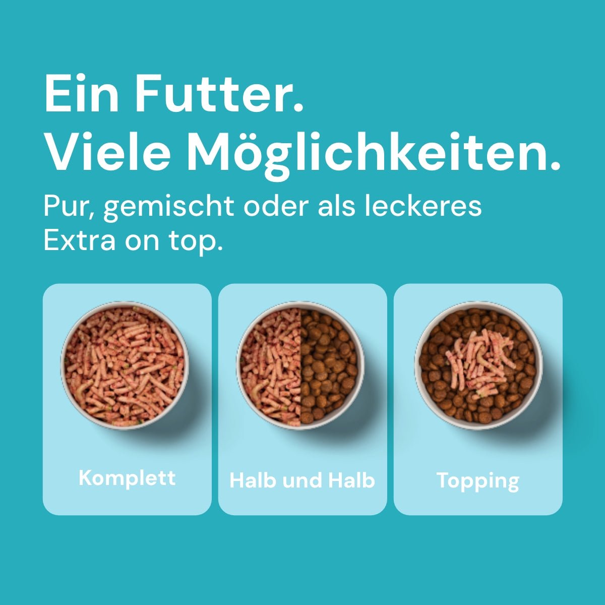 oder große Portionen: Du fütterst immer frisch, sicher und exakt nach Bedarf mit diesem hochwertigen Hundefutter.
